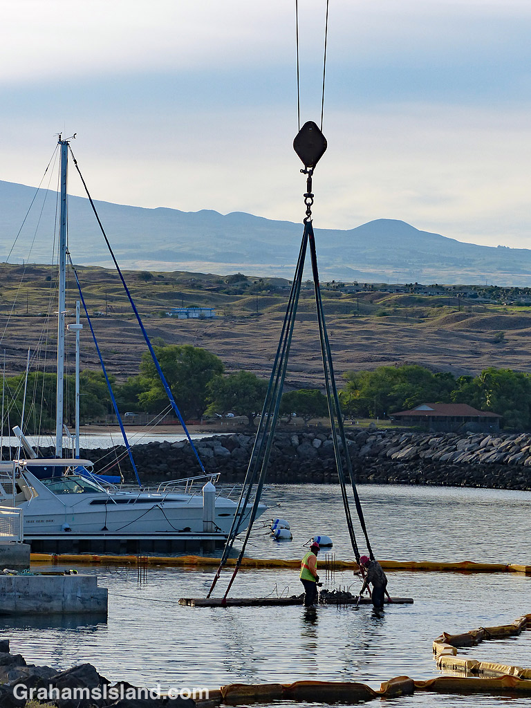 This is a photo of some construction work at the Kawaihae small boat harbor. They’re putting in a boat launch ramp and have been for some time. A crane has been there for weeks and is seen here hooked onto some kind of small receptacle while two guys in waders shovel dirt into it.