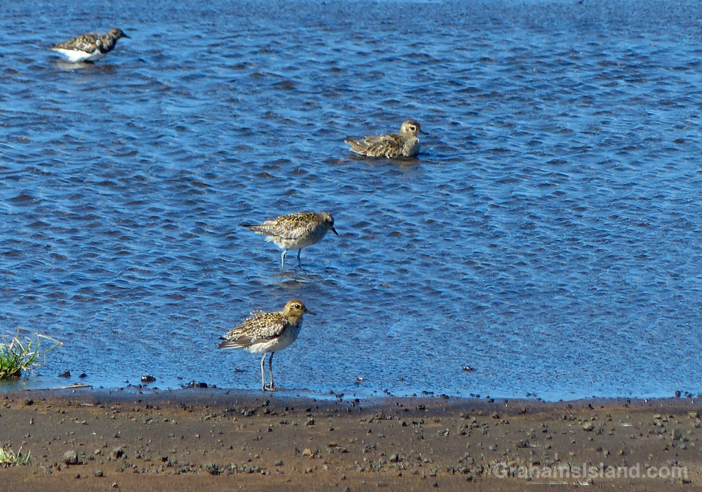 Pacific Golden Plovers (Pluvialis fulva) enjoying the water. In the winter, these birds migrate from Alaska to Hawaii where the bird is known as the Kolea. And the water? Sadly, not some tranquil mountain lake or forest pond. Instead, it’s a dip in the ground near the end of the runway of Upolu airport. Nice view though.