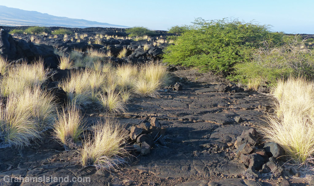 This is a stark landscape, unrelenting lava with occasional shrubs and tufts of fountain grass. But I like the history of the trail, its connection to the early days of Hawaii.