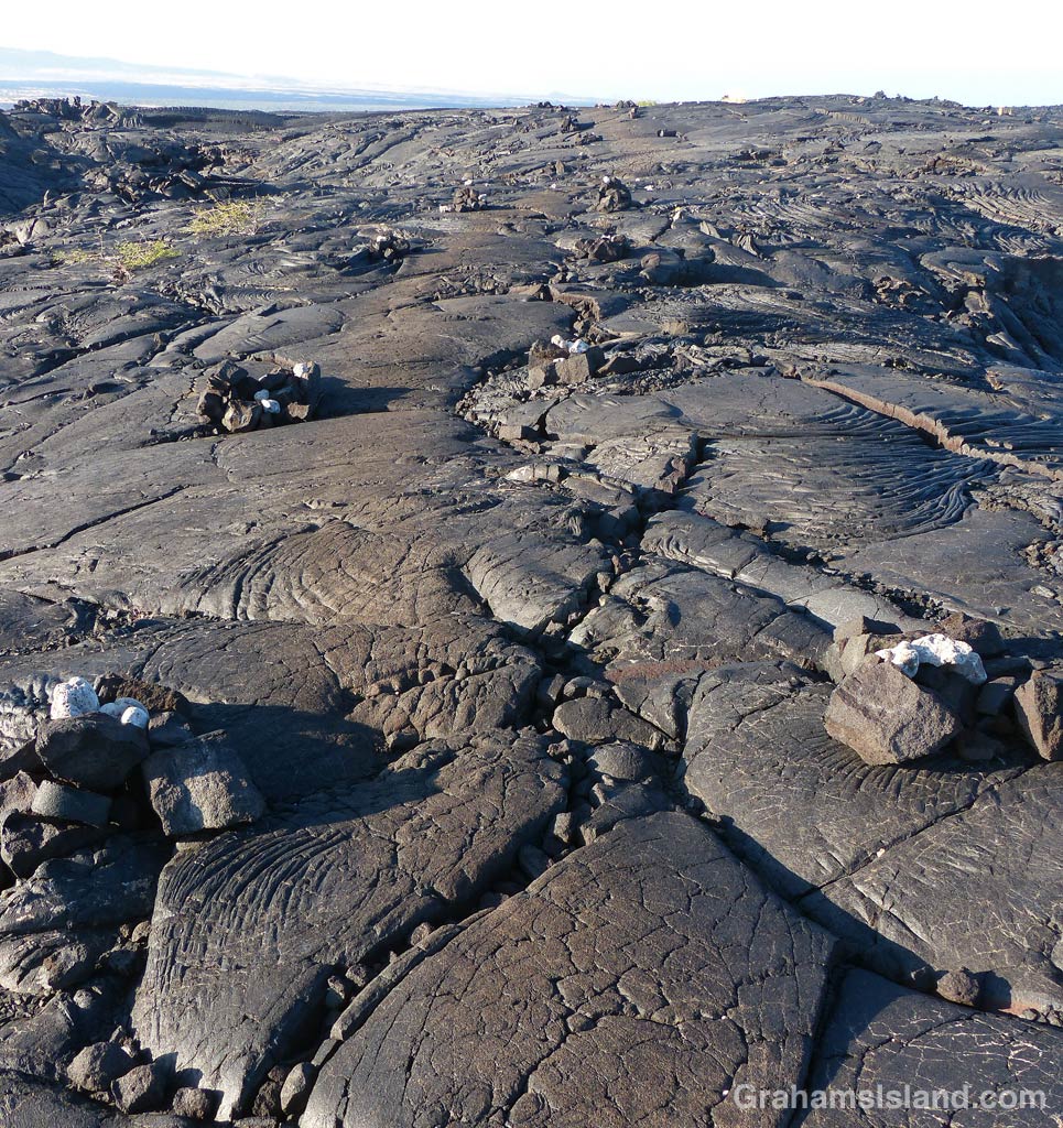 Instead, the trail wound over and around hummocks of pahoehoe lava and the way was marked mostly by cairns. Pahoehoe lava tends to be fairly smooth and rounded and is relatively easy to walk on, but still requires attention. It’s a matter of a moment’s inattention to end up jamming a foot into a crack and turning an ankle or worse. It’s also very easy to spot the next cairn, wander in its direction, then suddenly realize you don’t see any more because the trail has veered off to avoid some hole ahead or take advantage of easier going.