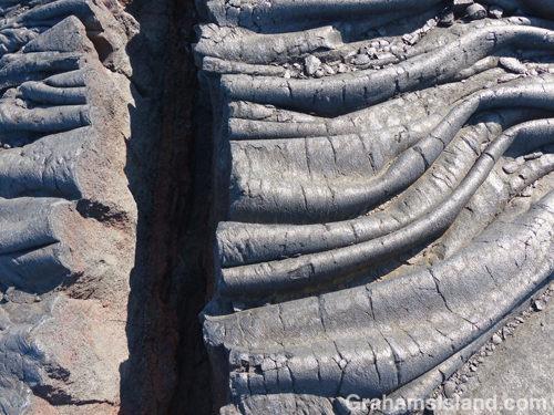 The trail covers the same pahoehoe lava flow experienced on the way south. Here though, a refreshing breeze and an expanse of ocean views, including a pair of whales blowing and slapping some way off, enhanced the experience.