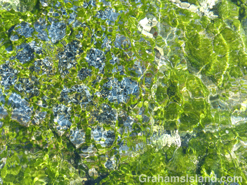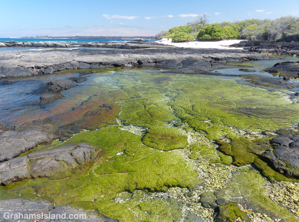 About half way along the trail is Ohiki Bay, a steep, mostly pebbled beach. A little farther still, some greenery appears, the cliffs dwindle, and the route follows the shore. Low pillows of lava have created inlets and pools, depending on the state of the tide. It was here that I found myself engrossed for the best part of an hour staring into the shallows. Incoming waves wrinkled the surface, highlighting the variety of colors and shapes.