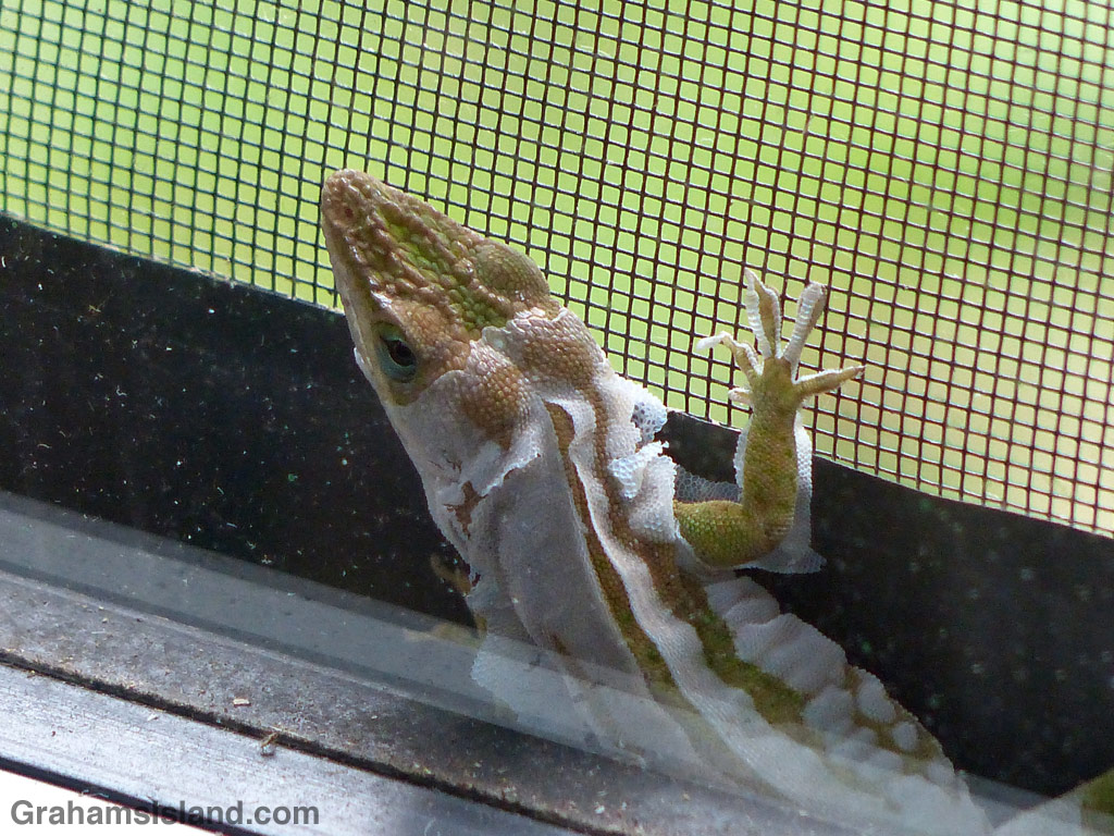 OK, so the headline is just clickbait (well, for some strange people maybe), but the big anole that lives in one of the windows recently shed his skin. The old layer had a lovely lacy look as it peeled away in the morning sun. When I next saw him, a couple of hours later, he was all done and looking splendid in his new outfit.