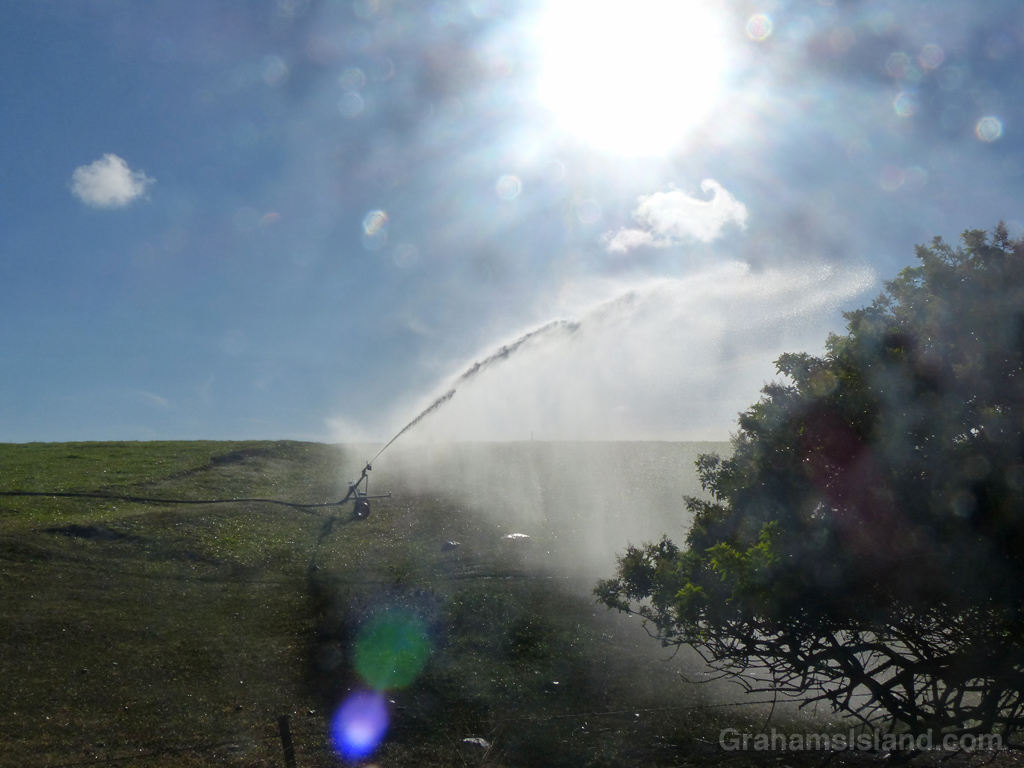 Irrigating the pastures of North Kohala. The water comes from the Kohala Ditch, an irrigation channel that runs from the northeast side of Kohala mountain to the dryer northwest end. The ditch was constructed back in 1906 to bring water to the sugar cane fields. These days the water goes to the many agricultural activities in the area.