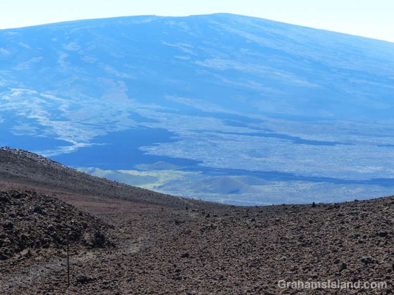 It’s a steady downhill slog, mostly with a loose surface underfoot (at one point I fell, my feet slipping out from under me, luckily leaving me with nothing worse than a couple of scrapes on one hand). I’d like to say the effort was worth it for the views, but the truth is, I can’t. Across the saddle, is Mauna Loa, which is a bigger volcano than Mauna Kea, but doesn’t look it. Mauna Loa (which means ‘long mountain’) has enormous mass, but not striking, steep sides. Otherwise, I was looking mostly at my feet or the same kind of landscape I was walking on.