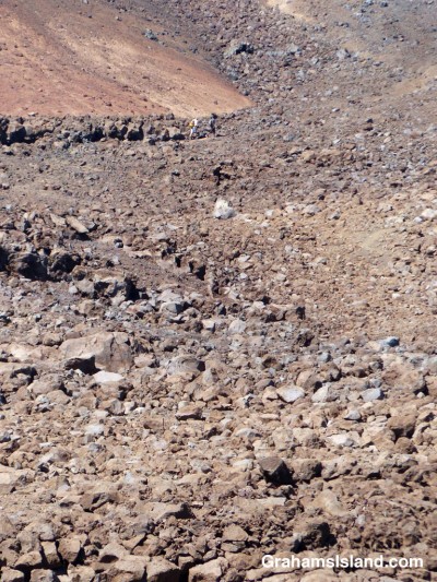 After the side trip to the lake, I started down again. Almost immediately I missed the trail down. I thought it intersected the Lake Waiau trail toward the road, but I soon realized that wasn’t true. So I angled across to the right one over loose lava, slipping often, but finally regaining the proper track.