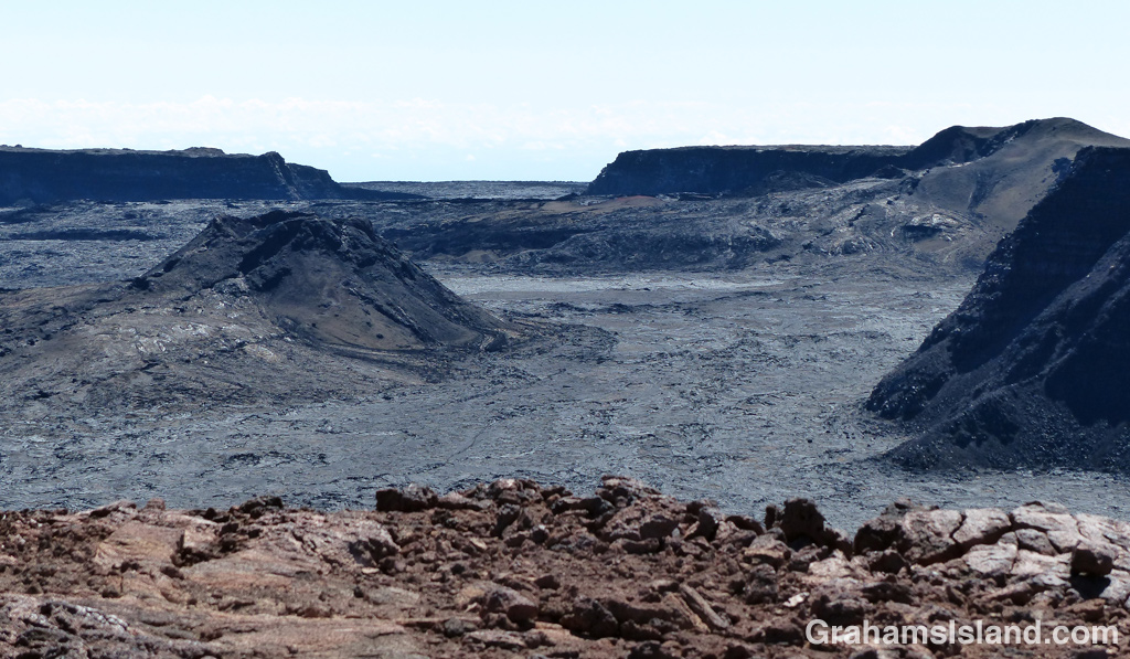 The trail rumbles uphill. It’s mostly steady going with occasional forays over more challenging a’a lava. The biggest thing, at least as far as I was concerned, is that it just keeps going. There are a succession of crests, not really ridges, just places that look like they’re a ridge. The first one or two didn’t raise any hopes because I knew I hadn’t gone that far. But after that, it’s a series of raised and dashed hopes – ‘maybe that’s the summit, oh no, there’s another one.’