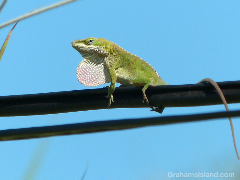 On this particular morning, a large green anole was out on the wire first. When one of the smaller ones approached, the big anole got agitated as anoles are wont to do. He began his ritual of head bobbing and puffing out his dewlap. The little fellow came on, sliding to the side of the wire. Suddenly it jumped onto the nearby telephone wire, scooted past, and leapt into the cane grass. The big anole spun around, but too late. He continued to extend his dewlap for a while to let any watchers, including me, know that this was his territory and he was not to be messed with. Point taken.