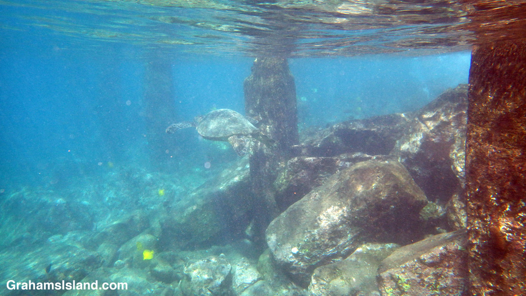 When the barracuda swam away, I tried to follow, but didn’t see it again. Instead, this green turtle slid by not two feet away. It pottered among the rocks, then came back out, passing me almost as close as before. I followed at a discreet distance, before it eased into the ruins of an old pier. I love seeing turtles in the water – they’re so graceful. First time I’ve had my camera with me.