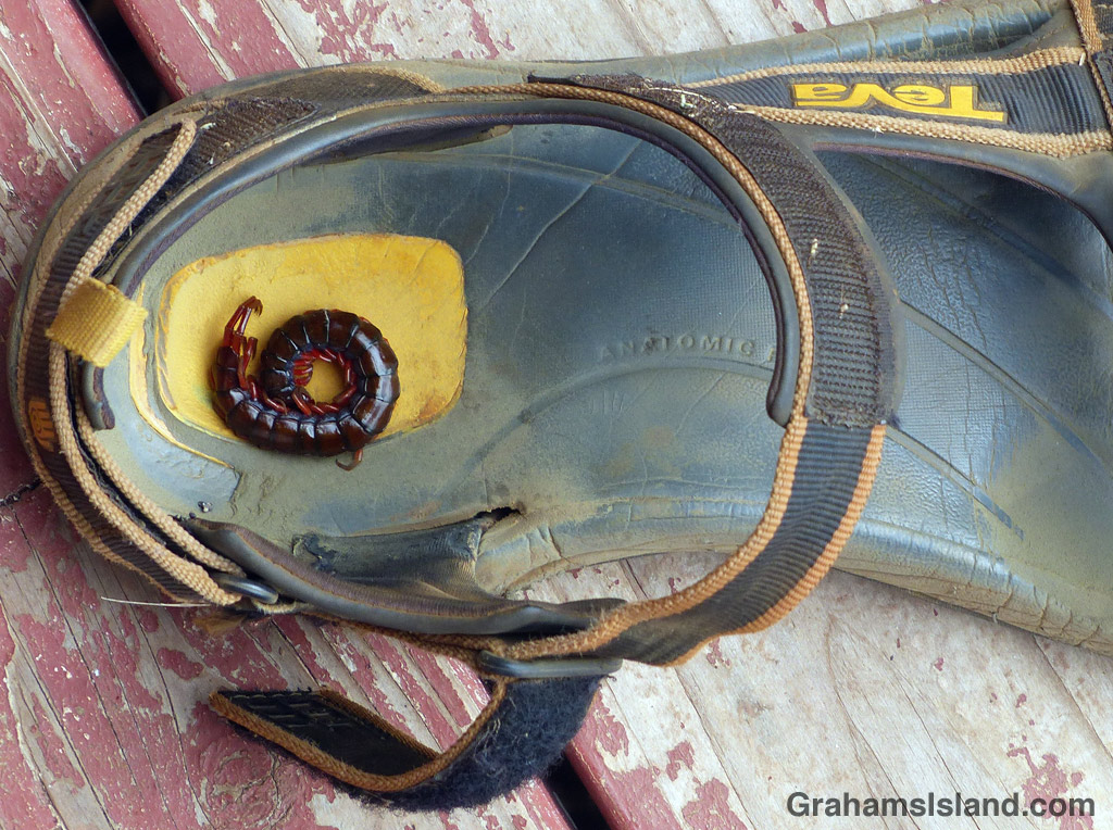 This is why it’s wise here to check clothes and shoes before use. Getting ready to go out for a walk, I glanced down and saw this centipede curled up in the heel of my sandal. Centipedes can give a very painful bite, so I’m told. I haven’t experienced one – yet. While this one wasn’t exactly lively, it was still alive. I can neither confirm nor deny that the poor fellow was overcome by fumes from the sandal.