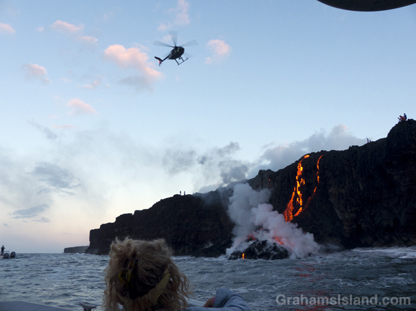 Once at the flow, the boat slowed and made passes back and forth. A couple of smaller boats were also around. Ashore, figures could be seen perched dangerously close to both the flow and the cliff edge. Several had gathered, with their cameras, on a raised knob of lava to one side of the flow. I hoped those photographers knew the risks they were taking. From their standpoint, they’d know they were near the edge, but from our vantage we could see that the knob they stood on was sharply undercut, a prime candidate to crash down at any time.