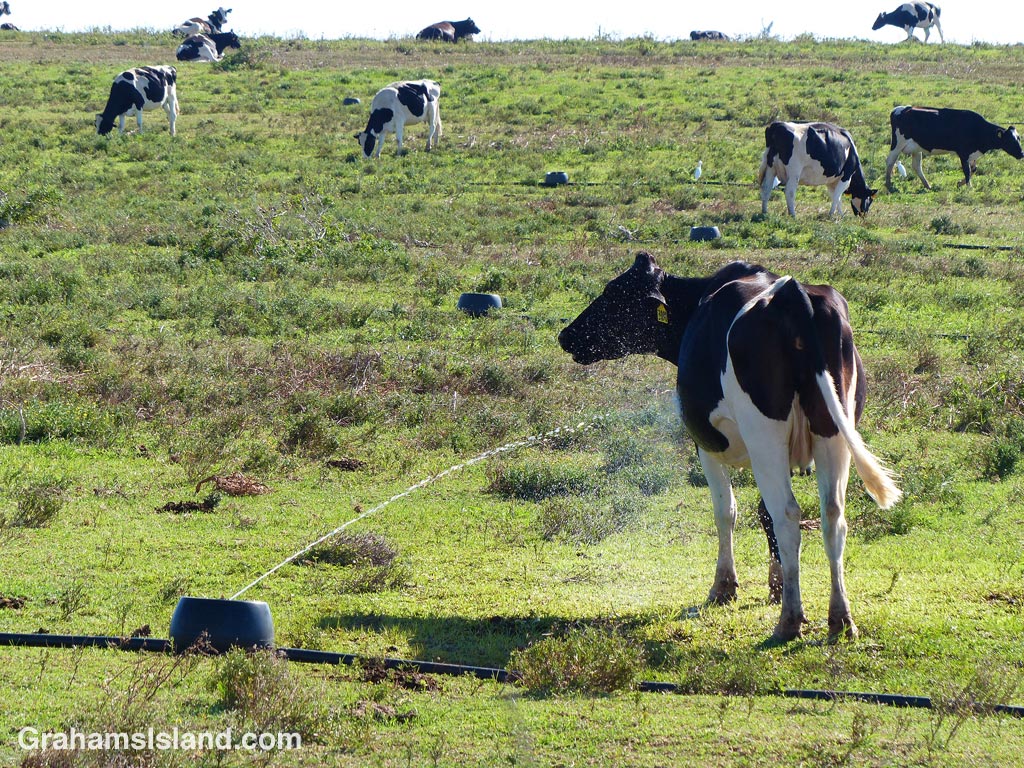 I’ve seen cows use the spray from these nozzles as water fountains. This one has figured out that such a flow makes for a nice, cooling shower on a warm afternoon. She stood there for several minutes, letting the water splash against her, before ambling off into the field.