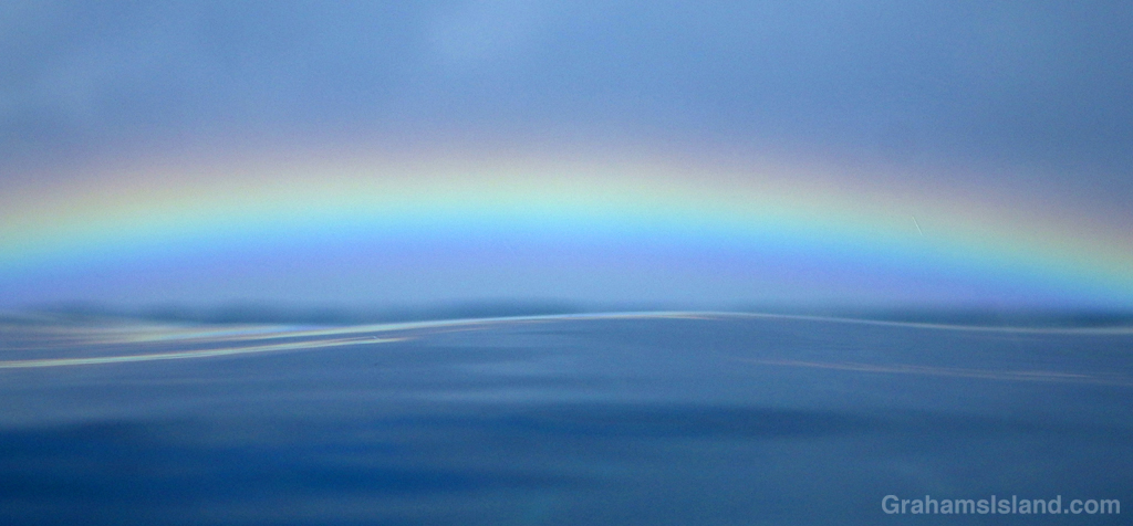 A low rainbow seen over a tranquil sea.