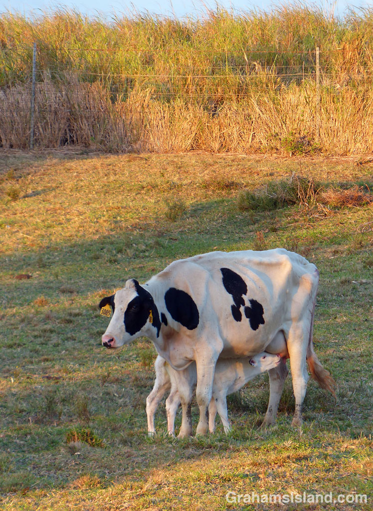 This calf is probably half-an-hour old. Mom was busy cleaning him while he got some nourishment. Then he decided to try out his very wobbly legs while mom followed, still cleaning.