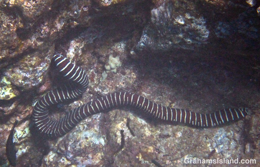 Zebra moray eel The distinctive markings of a zebra moray eel make it easy to spot when it’s out in the open, but they’re not as common as whitemouth morays. This one was in a relatively shallow area, working through cracks in the rock and coral. Like Loading...