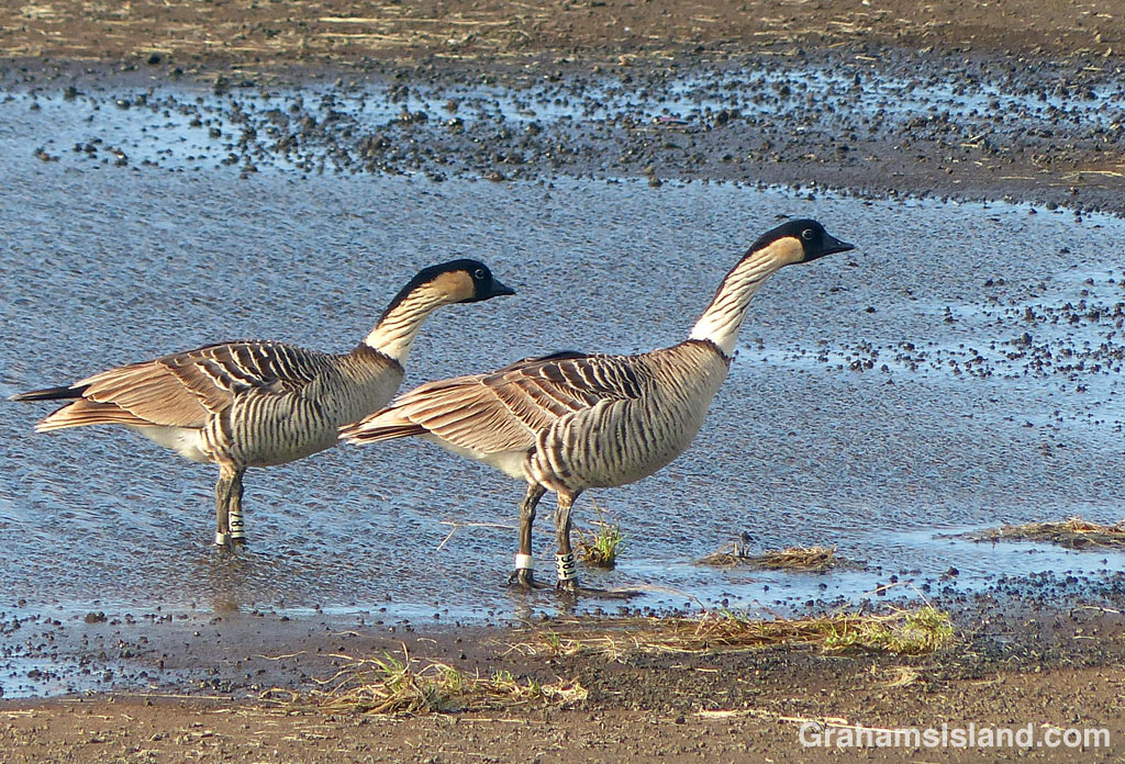 When it rains, large puddles form off to the side of the runway at Upolu Airport. These puddles are popular with a variety of birds, including these two nene, which were in fine voice.
