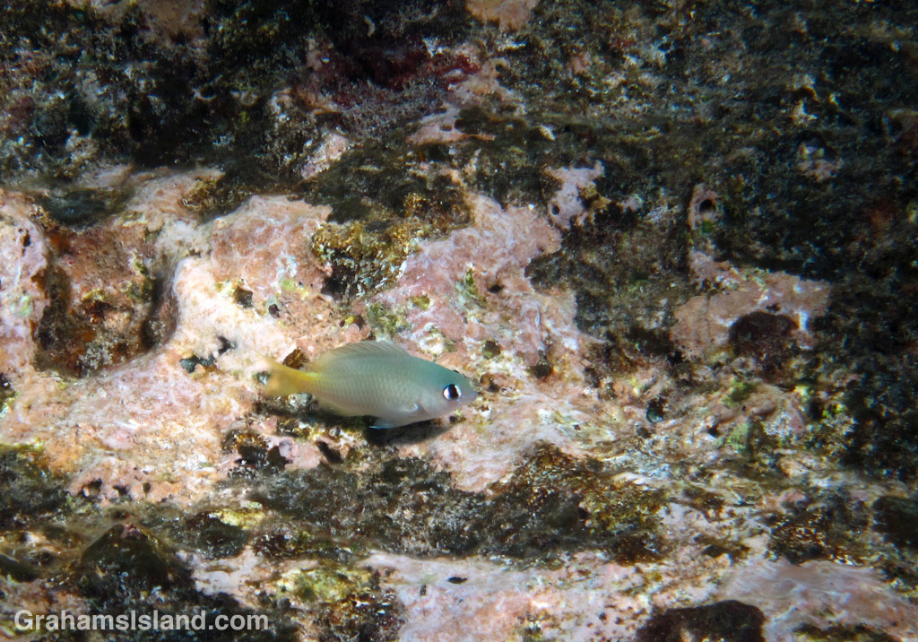 The aptly-named bright-eye damselfish is a tiny fish around 1 to 2 inches long. Despite its small size it aggressively defends its territory, usually a nook or hollow in the rock. It’s not unusual to see it come charging out at some much larger fish that has strayed too close.