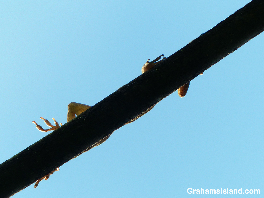 I posted once before here about how green anoles head back and forth from the house on the cable and power lines. This is a photo of one of them as seen from below.