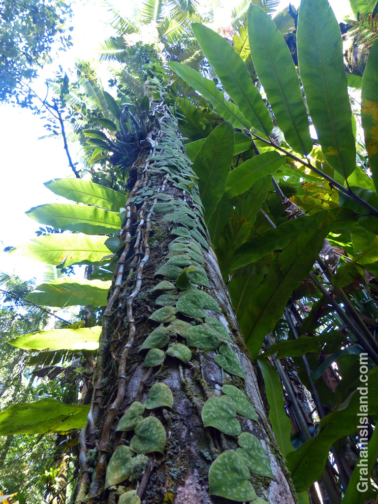 A satin pothos (Scindapsus pictus) climbs a tree in Hawaii Tropical Botanical Garden. While rampant in tropical climates, this plant is quite popular as a houseplant elsewhere. It’s poisonous to dogs and cats though, so that’s something to consider.