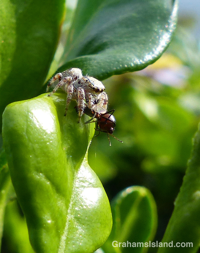 Not long after that, I was again watching butterflies and other bugs inhabiting a mock orange hedge, when I saw this little creature. Again, no more than a quarter inch long, it’s movement caught my eye against the glossy green of the mock orange leaves. A different kind of jumping spider, it hung around, enabling me to get this photo, because it had latched on to what I think is a parasitic wasp. Jumping spider don’t make webs, they pounce on their prey.