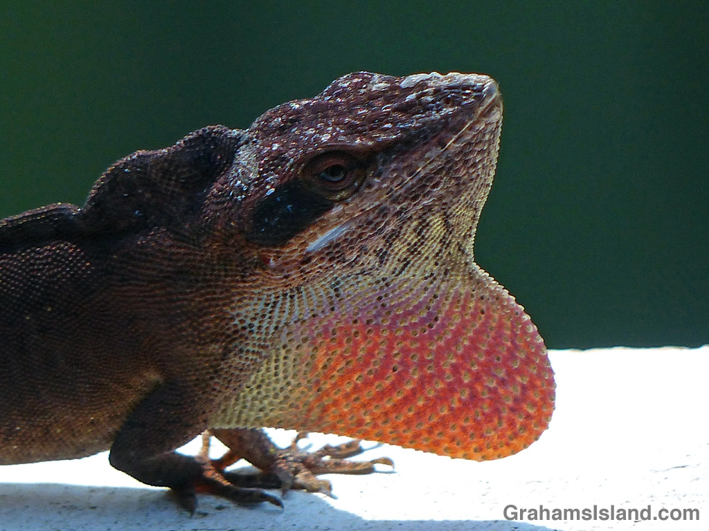 I saw this anole on the lanai one day and thought at first it was something new to me. It was a very deep brown with pronounced markings and it had a raised ridge on the back of its neck that I’d never seen before. It was already pretty agitated, but my taking photos riled it even more, causing it to strut around and puff out its dewlap.