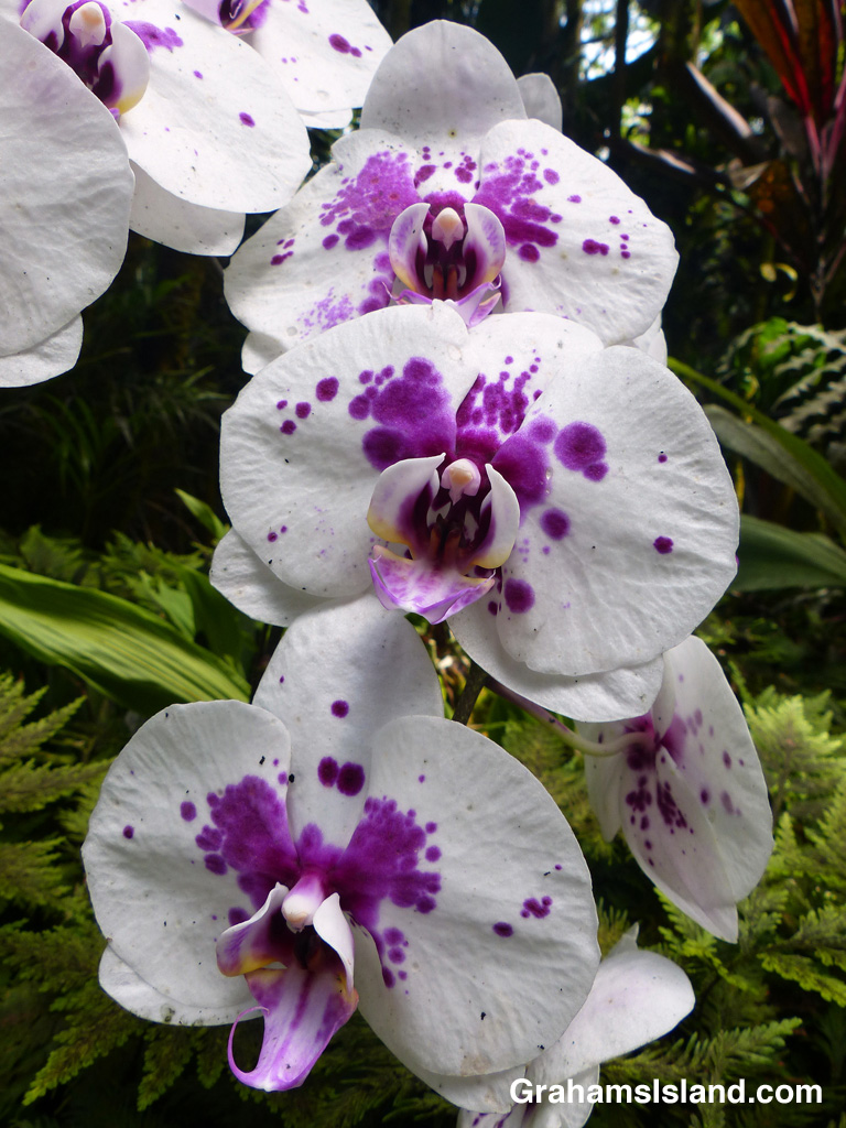 As with most of my orchid photos, I include the words ‘I think’ when it comes to talking about what it is. I think this is a Doritaenopsis hybrid. Doritaenopsis orchids are a cross of Phaleanopsis and Doritis orchids, in this case Champion Lightning and Chianxen Magpie. This one was at Hawaii Tropical Botanical Garden.