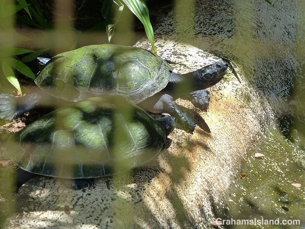 This pair of yellow-spotted Amazon river turtles were waiting for something at Pana‘ewa Rainforest Zoo & Gardens. Perhaps they were plotting a breakout, figuring out how to cut through the mesh, before making a plod for it.