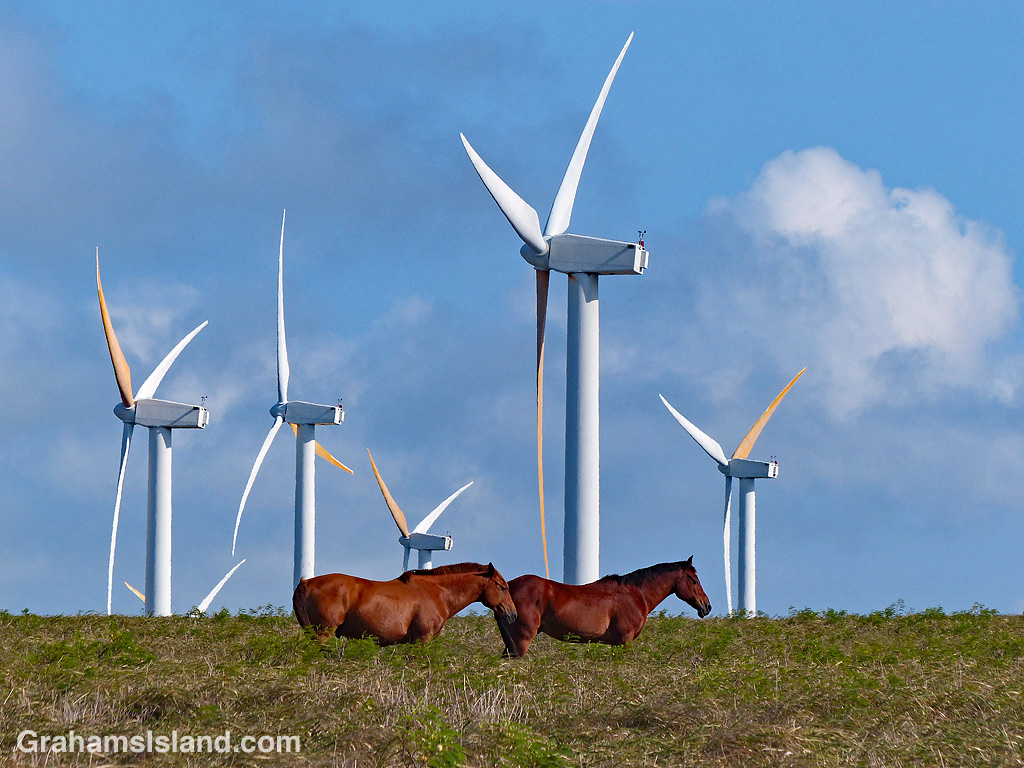 This pair of horses stood motionless for a long time while the turbines of Hawi Wind Farm whirled in the background. Don’t know what they were waiting for.