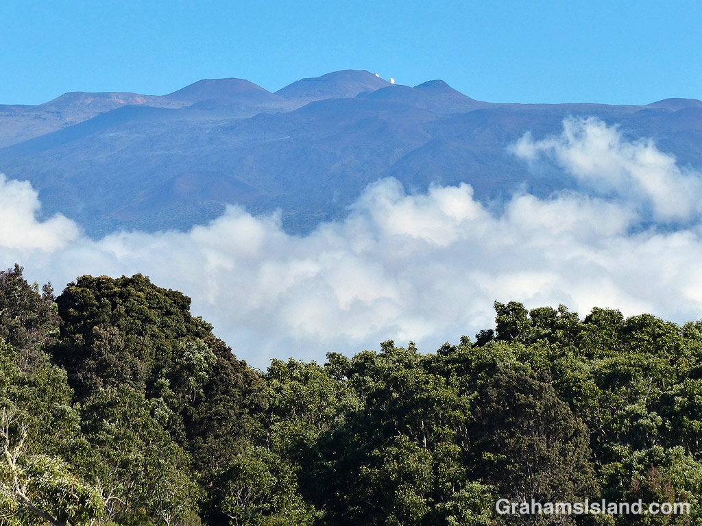In this view of Mauna Kea from the Pu’u O’o Trail, the trees of a kipuka, clouds rolling over the saddle, and the bulk of the mountain, create a layered effect.
