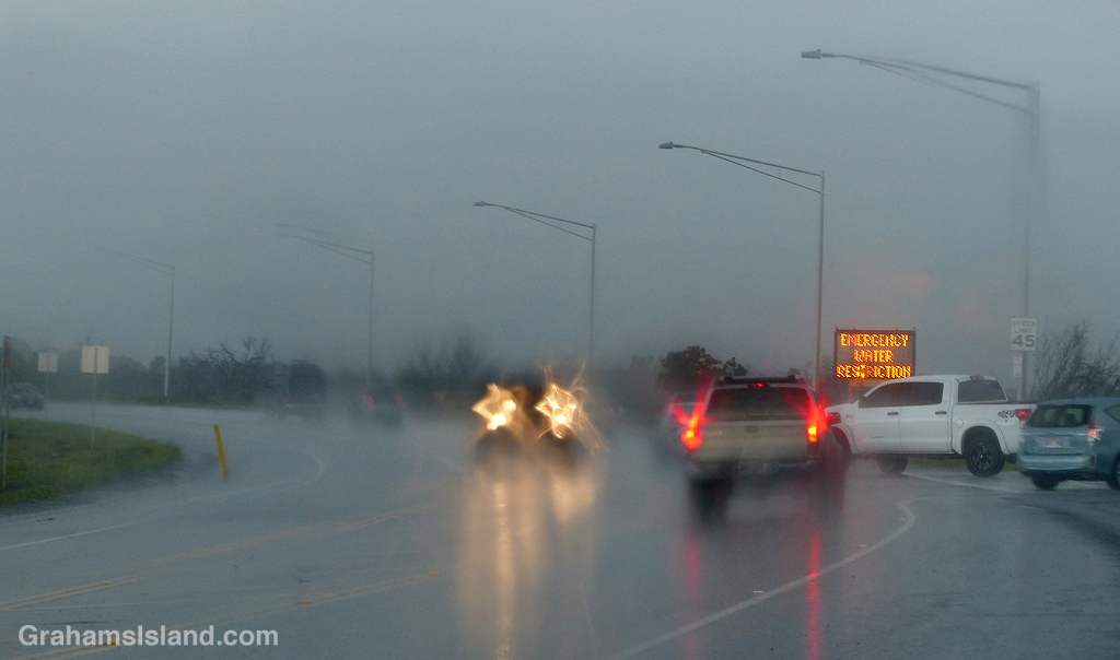 I was in Kailua Kona recently when I saw this electronic sign flashing “Emergency Water Restriction” and “Stop Sprinkler Use.” The irony, of course, was that I saw the sign during the kind of tropical downpour that washes cars, trees, and houses away. The road I was on was a shallow river. Entering one store, I had to wade through water lapping at my calves.
