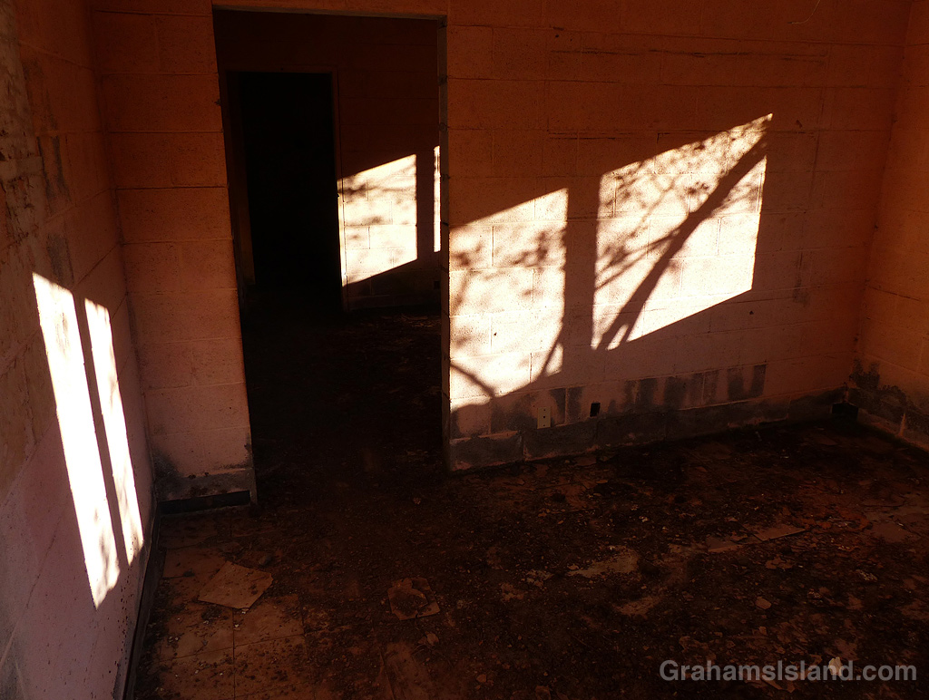 A few days ago I posted (here) about the view from an old blockhouse on the Pu’u Wa’awa’a trail. Today, I’m taking a look inside. As I mentioned before, the building is now a shelter for livestock with assorted detritus on the floor, but light through the empty windows still casts a bright image on the painted walls.
