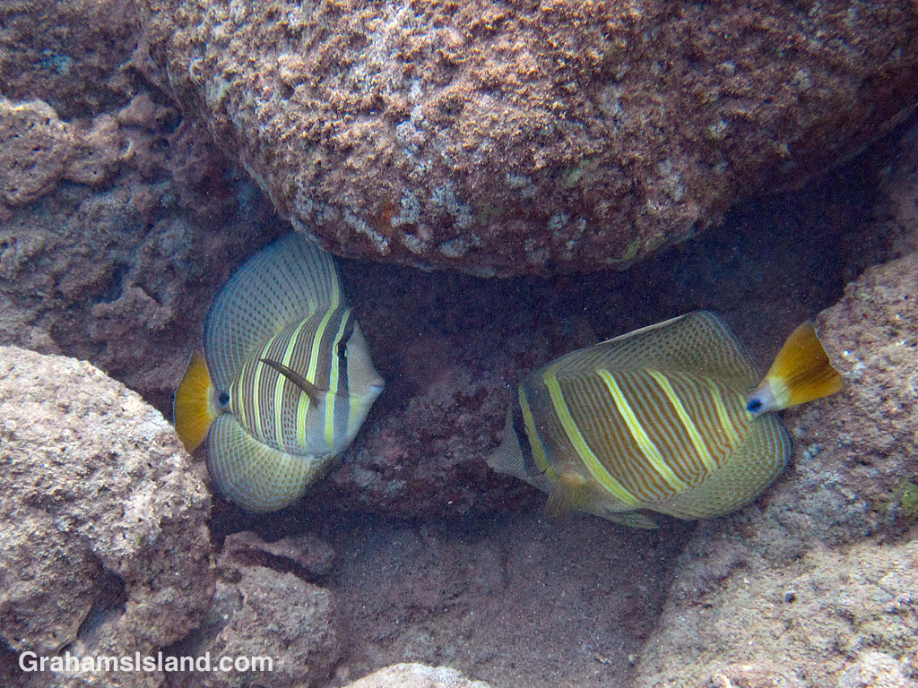 These two sailfin tangs, that I saw in shallow, murky water, were a first for me. They’re much paler and brighter, the thinner stripes are clearly defined, and their dorsal and anal fins are extended.
