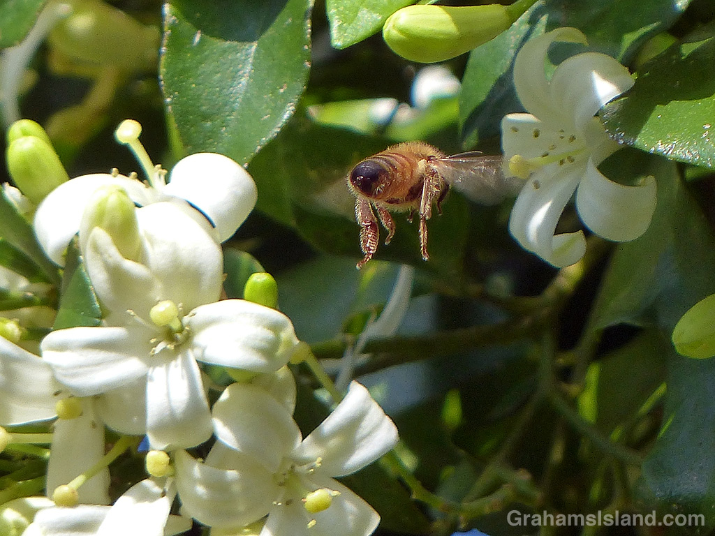 The most recent bloom encompassed the whole plant and also highlighted another of the plant’s attention-getters. It hums. It’s not unusual to wake up and, once the din of roosters and cardinals and francolins have been weeded out, a steady background hum takes over. This is the bees working over the mock orange flowers.