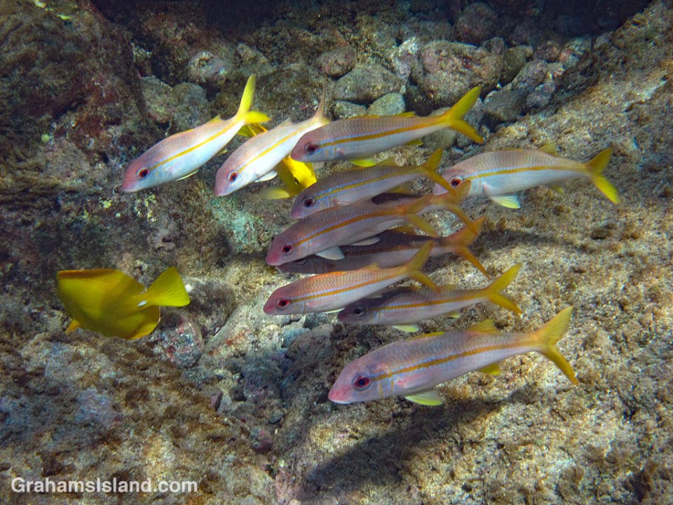 Yellowfin goatfish, like the very similar looking square-spot goatfish, are adherents to the theory that there’s safety in numbers. Younger fish, such as the ones in the photo, tend to meander around in clumps in shallow water. This group are looking suspiciously at a yellow tang.