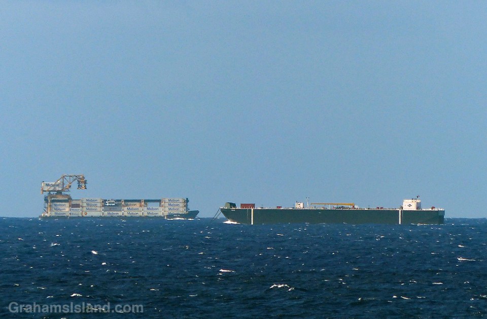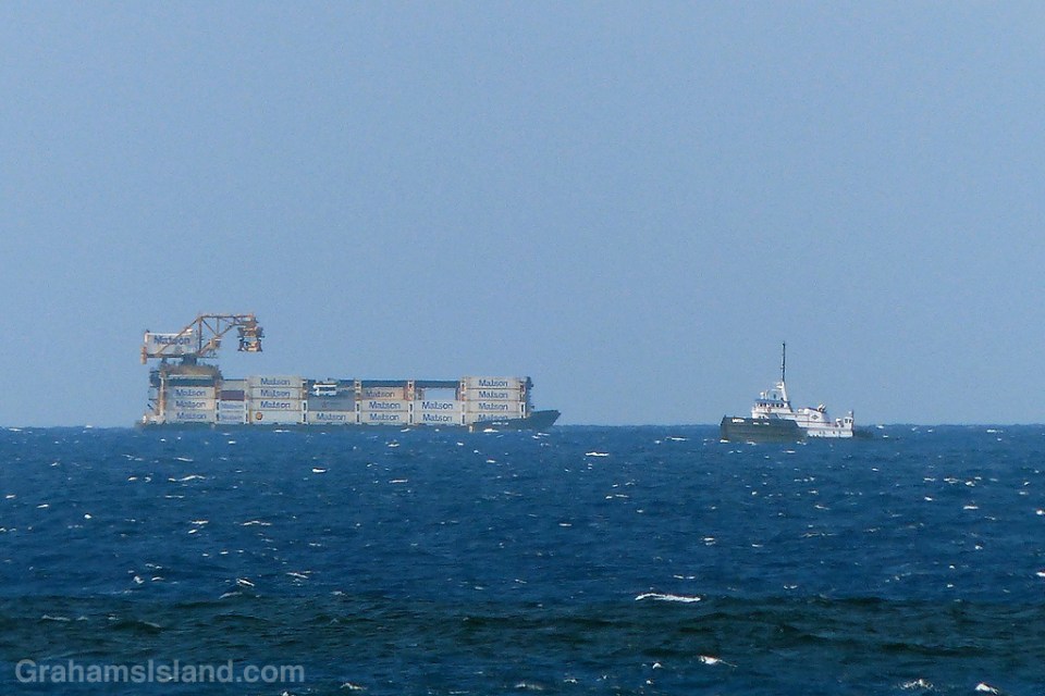 Barges that pass in the day The photo above poses the question as to whether this barge captain is entirely clear on the concept. The photo below reveals that, yes, he or she is. These are two of the inter-island barges passing in the Alenuihaha Channel. Like Loading...