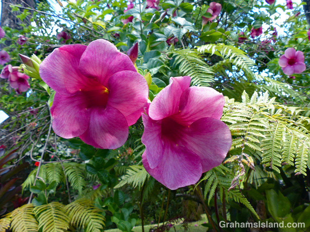 Purple allamanda is a member of the dogbane (Apocynaceae) family. It’s an evergreen tropical shrub that produces a generous display of large flowers. However, all the parts of the plant are toxic if swallowed and the milky white sap can be irritating for skin, so be warned.