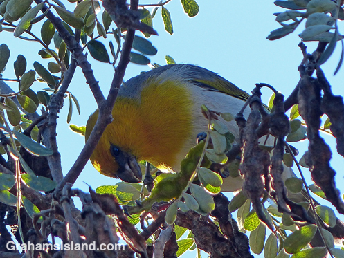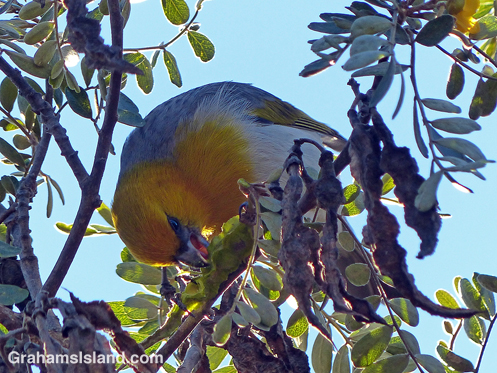 I quickly snapped a few photos, desperate to get some kind of record of this elusive bird before it disappeared. I needn’t have worried. It seemed unconcerned by my presence and was soon joined by several others. What was most striking was their feeding habit. A palila would pluck a green seed pod and take it to another branch. Once it was settled, the reason for its it stocky bill became apparent. It absolutely hammered at the pod, pinning it to the branch and banging away with its beak to access the seeds. The image of a workman smashing concrete with a pneumatic drill popped into my mind.