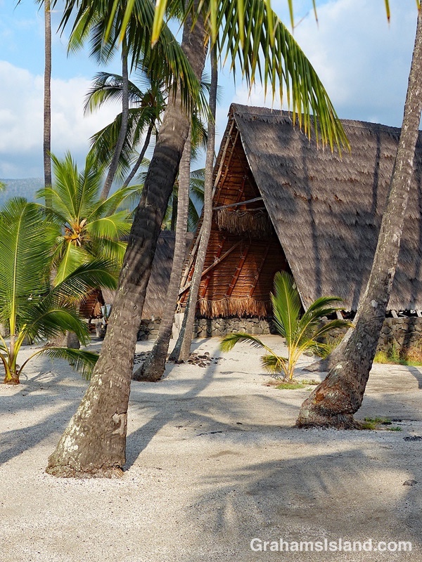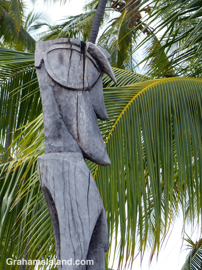 Here are views from the ocean side (above), of a hālau (right) which houses canoes, and of a ki’i (below) representing an Hawaiian god.