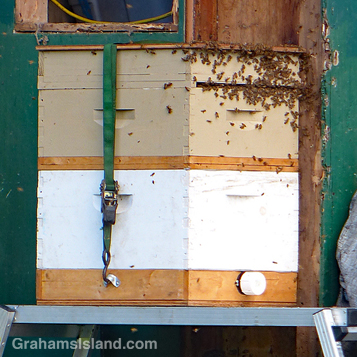 After the lawn was mowed, the bee wranglers were still on the scene so I left the truck where it was. A couple of hours later I thought it would be safe to retrieve it. As I reached the house, the bee wranglers were just leaving. We chatted a bit about what they’d been doing. They’d cleaned out the bees’ home in the wall and put a new hive next to it. Presumably they’d found the queen and installed her in her new digs. The idea is to have the bees relocate to the new hive and, when they’re settled in, move it to a new location, probably on one of the farms around here.