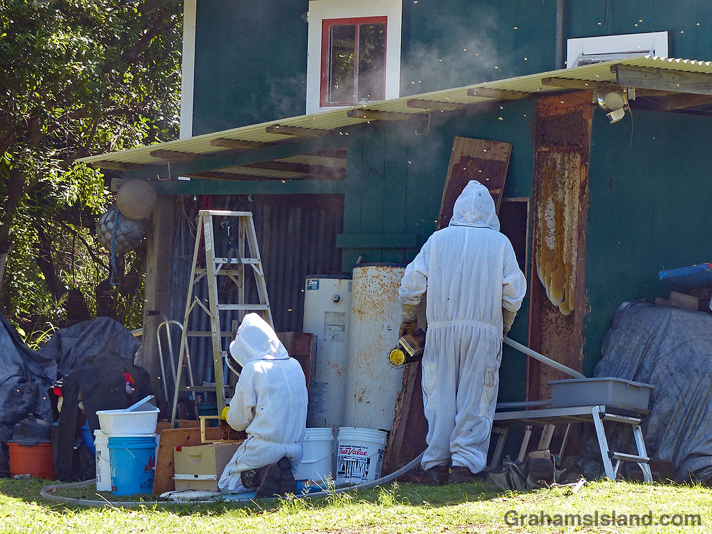 Recently, when I moved my truck to mow the lawn, I noticed this scene at a neighbor’s house. I was impressed by the number of bees and the huge, hanging combs filled with sweet honey. When I got out of the truck, I thought I’d get a few photos.