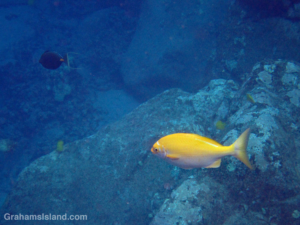 This fish is a gray chub, so why is it yellow? That’s a question with no good answer. Locals used to think that yellow-colored chubs were ‘queens’ of their schools, but there’s no evidence to support that. Instead, it’s regarded as simply a color variation, seen in a few fish, that is without significance. This is the first one of these I’ve seen.