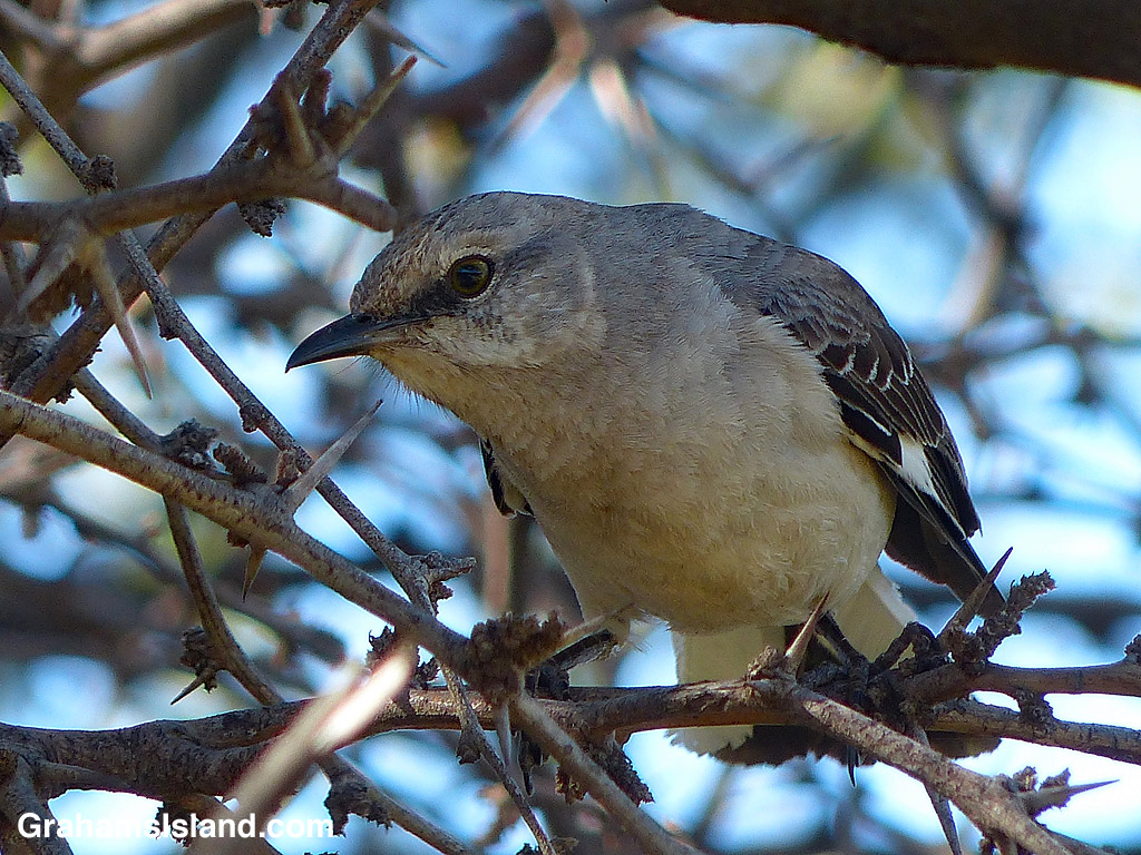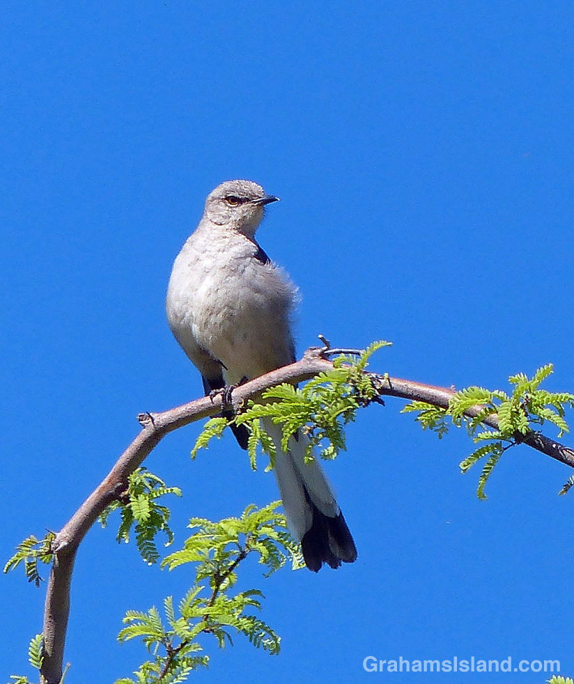 The northern mockingbird arrived in Hawaii in 1928 and is quite common now. It is most easily seen when it perches at the top of a tree and sings, as in the photo to the left. Later, this one descended into the heart of a kiawe tree where it looked out from the tangle of branches and thorns.