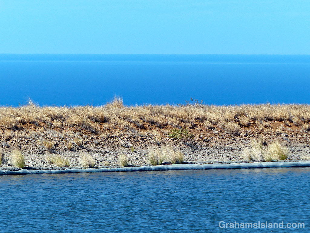 In the foreground, a reservoir bordered by some kind of waterproof lining. Then a dirt bank and beyond that, the Pacific Ocean and blue sky.