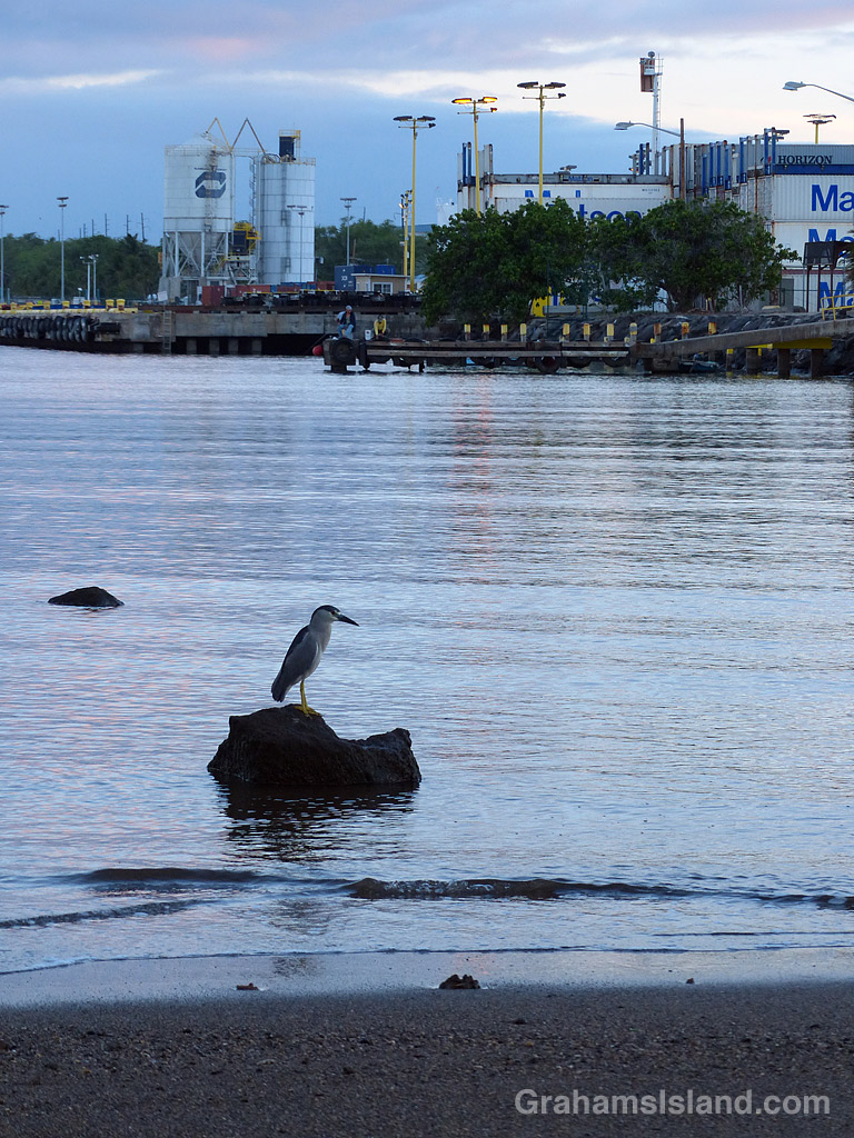 Indeed, the heron remained mostly still. It was just dark enough for the lights of the port to illuminate the rippled waters inside the harbor. The port itself was also quiet. No boats moving, no trucks lining up, no machinery grinding. Just a couple of men fishing off the small boat dock.