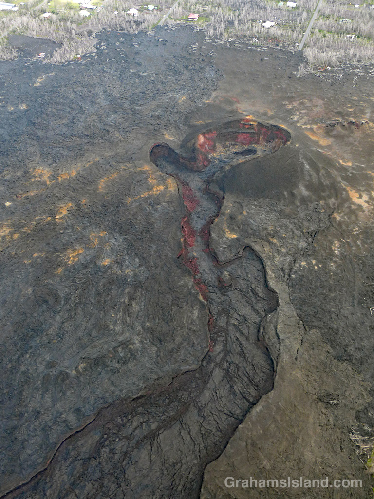 These photos show Fissure 8, the source of the main flow. The top photo shows Fissure 8’s location, bordered by houses in Leilani Estates that escaped destruction during the eruption. In the middle, the main crater and the ‘canal’ that channeled the flow toward the coast. Below, another view of Fissure 8 and the wasteland of destruction surrounding it.