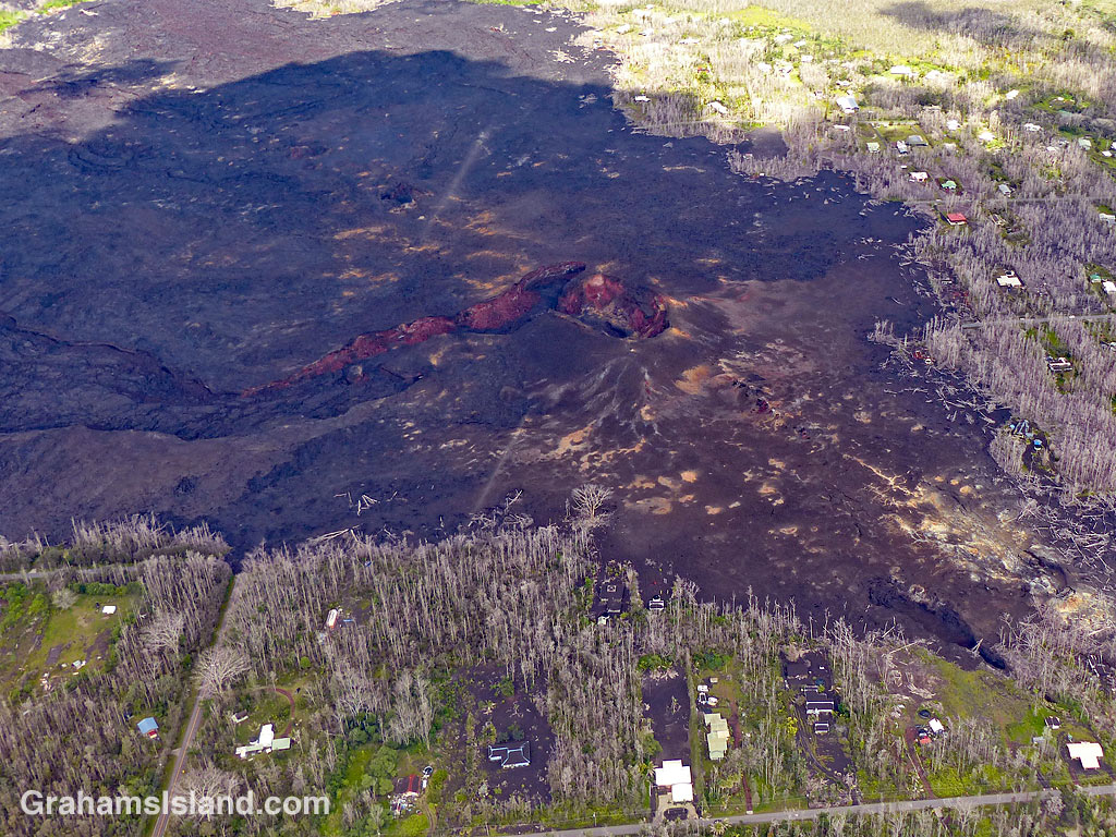By the end of May, 24 fissures had discharged lava. Two of those sent flows down to the coast, but at the end of May the main eruption settled on Fissure 8. A river of lava flowed northeast, inundating Highway 132 and reaching the ocean at Kapoho Bay in early June. This flow continued into August, but by the end of that month all activity had more or less ceased. In all, more than 700 homes were destroyed during the eruption, but more than 800 acres of new land had been formed.