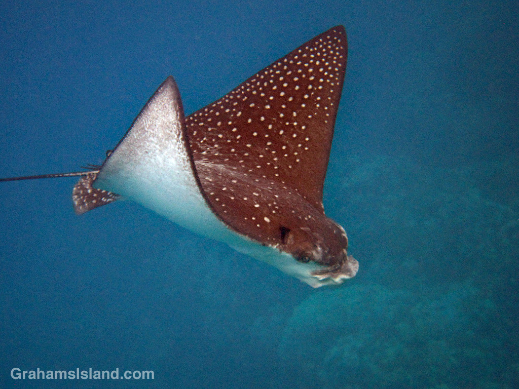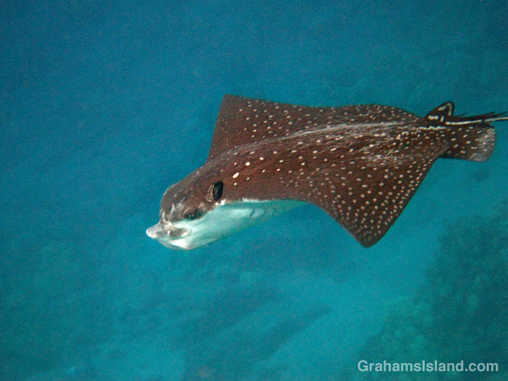 Spotted eagle rays fall into this latter category. They can cover large distances, but tend to feed on sandy bottoms, shoveling the sand with their bills to uncover the marine invertebrates that they feed on.