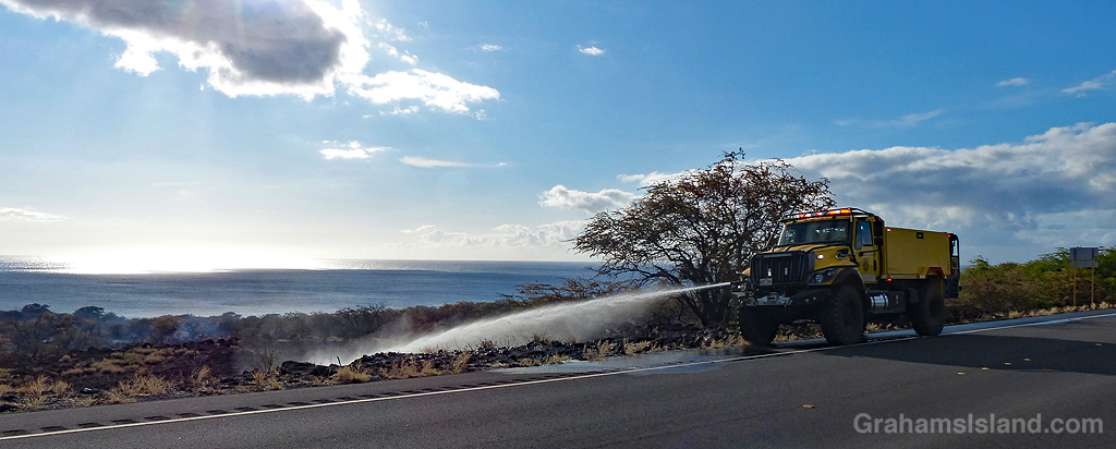 I wondered if I should call 911. Perhaps the fire was thought to be extinguished and had rekindled in the wind. Before I made up my mind, a large yellow truck emerged from a cutting down the road and began spraying water onto the area beside the highway, which was where I was standing (bottom photo). I decided it was a good time to return to my truck.