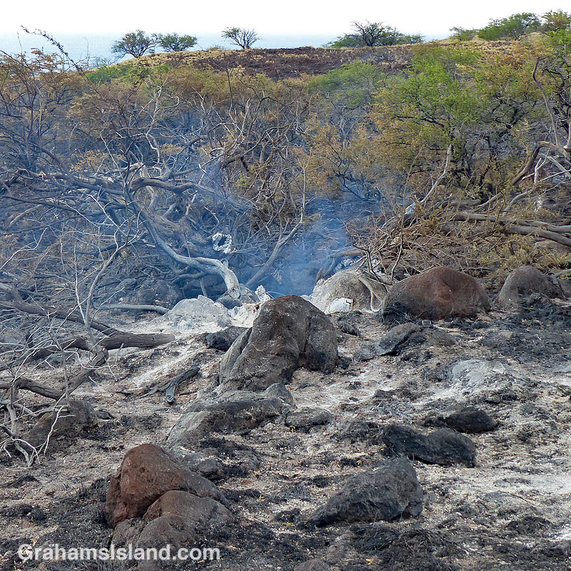 When I returned home late that afternoon, I thought I’d check out the scene of the fire. I was surprised to still see smoke rising in several places, and nobody around. Cars on the highway drove by, barely slowing down. I got out and had a wander along the roadside and then ventured into the ashy ground, all smoky and warm (middle photo). What I didn’t see was any firefighters.