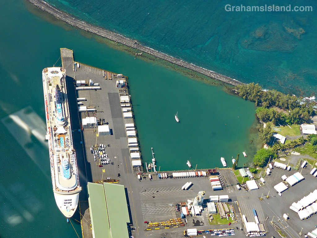 I chose this photo for two reasons. The first is the subject of the photo, a cruise ship docked at Hilo. This ship visits Hilo every Tuesday, then continues on to Kailua Kona on Wednesday. It brings an influx of tourists on those two days, who fan out across the island, taking tours to various sights island-wide. It also considerably boosts the population of those two towns on those two days, such that I generally choose not to go there if I remember the cruise ship is in.